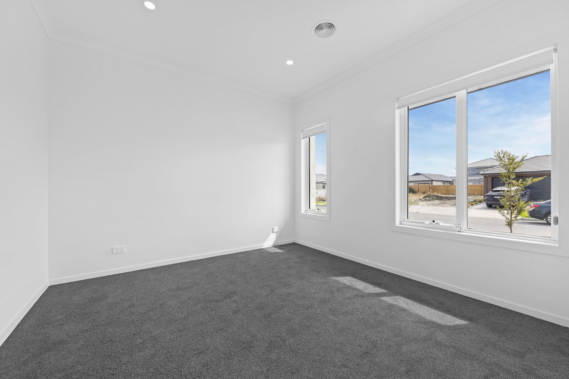 Master Suite: The spacious master bedroom features plush carpeting, a walk-in wardrobe, and a private ensuite equipped with double sinks for added convenience.